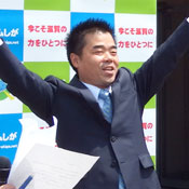 三日月氏は「危なっかしいアベノミクスでなく、滋賀の力を生かしたビワコノミクスで県を健全に維持、発展させたい」と、必勝を誓った。