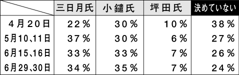 塚本氏らが四月二十日に実施した県政世論調査では、もし嘉田氏が出ない場合では、小鑓氏が三〇%、三日月氏二二%、共産推薦の坪田五久男氏一〇%、「決めてない」三八%で、小鑓氏が三日月氏を約一〇ポイント近く引き離していた。