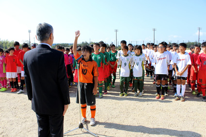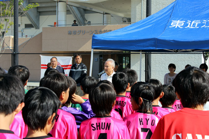 開会式では、滋賀報知新聞社の冨田正敏社長、MIOびわこ滋賀の権田五仁代表、東近江市サッカー協会の村山伸二会長らが激励に駆けつけ、「(審判がフェアプレー精神を発揮した選手に示す)グリーンカードをめざし、最後まであきらめず優勝めざしてがんばってください」「(オリンピックやJリーグなど)高い目標をもって、お世話になっている人への感謝を忘れず、悔いのないように」などと激励。選手を代表してリブラ五個荘FCの阿藤飛也主将の「日ごろの練習の成果をすべて出しきり、正々堂々と戦うことを誓います」と力強い宣誓で、大会の幕が上がった。