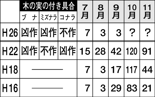 しかし、九月~十月に長浜・高島両市内の山岳地帯で実施した結実調査では、高地に生育するブナの実はほとんど確認されず、ミズナラも少なく、全体的に不作とみて、低地のコナラ、クリの実を求めて集落に出没する可能性が高いとみた。