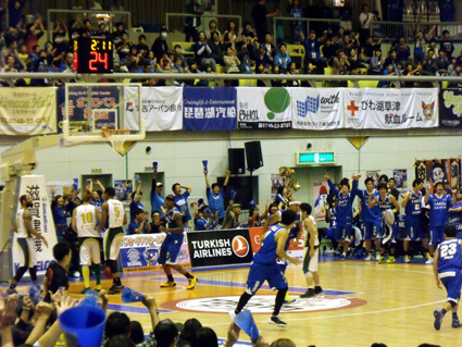 試合が始まると、レイクスのチームカラーでもあるブルーのユニホームを着た子どもたちが、選手へ向け大きな声援を送り、また、レイクスのタオルを掲げて応援するブースター(ファンの呼称)で、会場は盛大に盛り上がった。