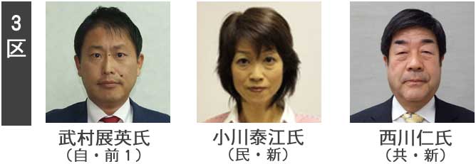 滋賀3区(草津市、守山市、栗東市、野洲市)は自民前職の武村展英(42)に前守山市議で民主新人の小川泰江(51)と元県議の共産新人西川仁(67)が挑む。比例復活の三日月の辞職で、民主候補の空白地となっていた。