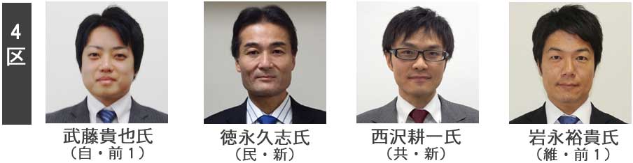 滋賀4区(近江八幡市、旧愛東町・旧湖東町を除く東近江市、甲賀市、湖南市、日野町、竜王町)は、自民前職の武藤貴也(35)と維新前職の岩永裕貴(41)、元参議員で民主新人の徳永久志(51)、共産新人の西沢耕一(36)の四人が名乗りを上げる。前回、武藤に敗れた民主候補の地盤を、徳永が引き継ぐ。