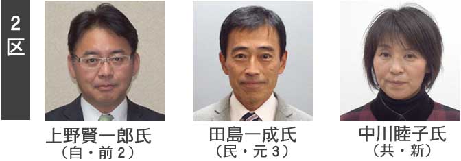 2区 自民上野と民主田島が激突 追い上げ図る 共産中川
