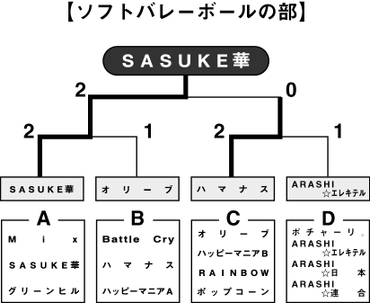 ソフトバレーボールの部は十四チームが四グループに分れての予選リーグを戦い、各グループ一位の四チームによる決勝トーナメントではオリーブにSASUKE華が、ARASHI☆エレキテルにハマナスが、いずれもフルセットで制して決勝へ進んだ。死闘に続く死闘の結果、SASUKE華が2―0で頂点に立った。