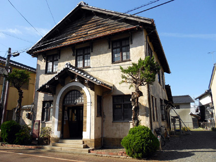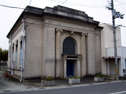 旧滋賀銀行甲南支店は、大正十四年(一九二五)、ヴォーリズ建築事務所の設計で、寺庄集落中心の杣街道沿いに建設された。鉄筋コンクリート造二階建てで、玄関上部に半円アーチの窓、そして装飾的な要石を飾る。