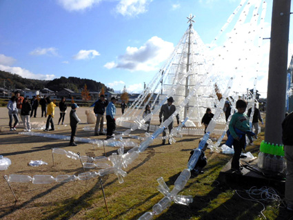 十五年に「地域の子どもは地域で見守ろう」と結成された阿育(あしょか)の子育成会の活動の一環として、「もったいないを地域で活かしたい」とペットボトルを利用して始めたイルミネーションは、十二年目を迎える。他府県からも多くの人が訪れ、冬の風物詩となっている。
