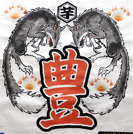 今回は、会の結成二十周年を記念しての二十畳敷大凧で、図柄は上部に地元松尾神社にある二つの稲荷社のうち末永稲荷のシンボルであるキツネと火炎宝珠の絵と下部の朱文字「豊」で、絵に意味をもたせる判じもんを「末永く豊なれ」と読ませる。上部中央には会の紋章が配置され、凧の風格を高めている。