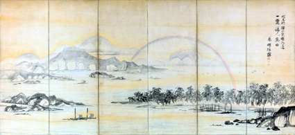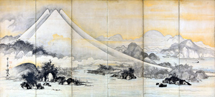 一方、「曽我蕭白『富士三保図屏風』と日本美術の愉悦」は、奇想の画家である蕭白の名作と、神像、古陶磁、漆器といった日本美術が織りなす和の響きを演出するもの。蕭白が、日本の象徴・富士山の品格をいかに表現したのか。そして日月を思わせる山容の不可思議な造形に、巨大な虹がかかる空間が現出する。展示総数は七十件(重要文化財一件、初公開十四件)。