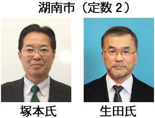 【湖南市】塚本茂樹(50)無新・民チ推▽生田邦夫(67)自現2。