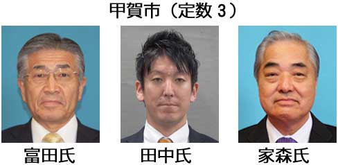 【甲賀市】富田博明(63)自現1▽田中松太郎(42)民新・チ推▽家森茂樹(63)自現5。