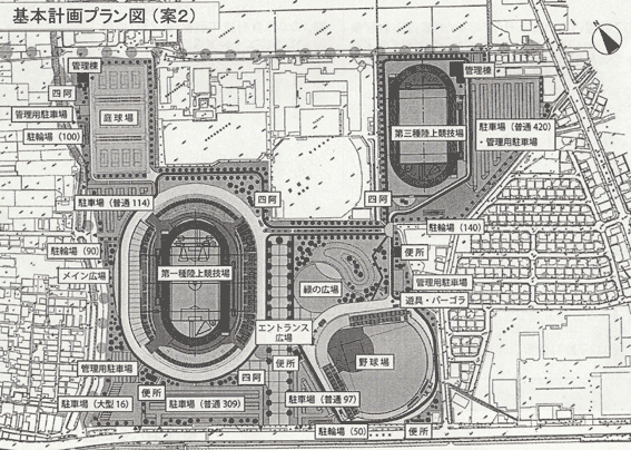 計画では、メインとサブの陸上競技場、野球場の整備はすでに決定している。これに加える二通りの案の内容は、▽「案1」=公園中央に庭球場(現状五百席から千席へ拡充)、西側に多目的広場▽「案2」=公園中央に緑の広場、西側に庭球場(同)―となっている。