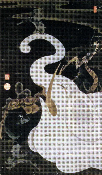 伊藤若冲(一七一六~一八〇〇)は、京都の青物問屋の長男として生まれ、極彩色の細密な作品を描く一方、当時長崎から日本へ入ってきた中国・朝鮮絵画から影響を受け、水墨画や版画などでも個性的な作品を数多く残した。