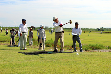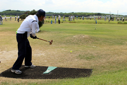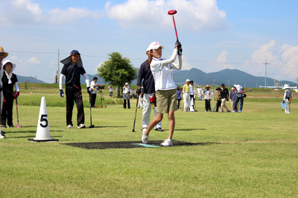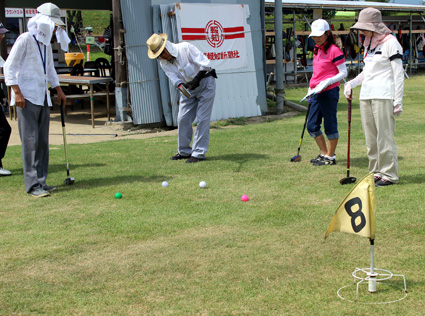 冨田社長と加藤誠一県議による始球式のあと、五―六人のグループが全三十二ホールに散らばりゲーム開始。十五メートルから五十メートルまでのコース上には、複雑な起伏や、樹木やマウンドなどの障害物も設けられ、ショートホールでも難コースが設定されるなど、選手たちはホール攻略に悪戦苦闘しながらも、ホールインワンを決めて喜び、プロゴルファー顔負けのナイスショットやナイスパットで、ハッスルプレーに一喜一憂した。