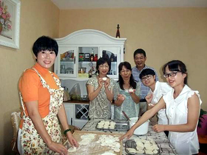 県国際協会が一般公募した県民交流団のグループ三人(写真奥)が湖南省の一般家庭を訪問し、餃子づくりを共同で行い盛り上がった。