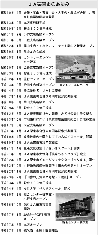 佐野 先人が築いてくれた中で一つは昭和五十九年にカントリーエレベーター(六地蔵)を設置し、米と麦、大豆を中心にした受け入れ体制が完備された。二つめは平成二十五年に、地域農業の拠点として総合センター「桃李(とうり)館」(小野)がオープンしたことである。