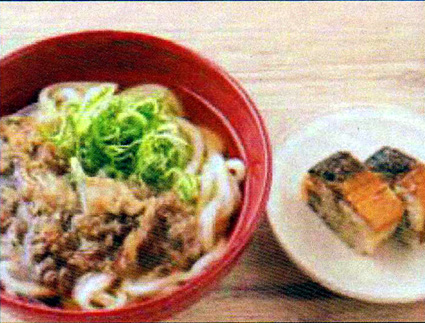 「近江長浜セット」(千二百円・税込み)は、県産小麦一〇〇%の近江うどんに、近江牛のうま味もからめた逸品。長浜名物の焼き鯖寿司もセットにした。