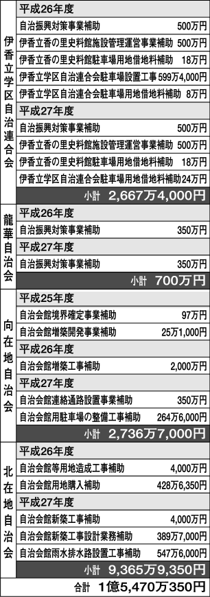 迷惑料は二十六年度だけで、今回の伊香立を始め、大石、田上、南郷の四つの学区自治連合会と学区内の単位自治会に二億三千万円が支出されている。伊香立学区はまさに氷山の一角にすぎないのだ。
