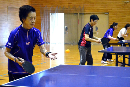 現役のアマチュア卓球選手として活躍している井上幸子さんは、昭和三年五月生まれの八十七歳。元気に練習に励んでいる。