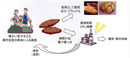 イモ発電が同市で注目されたきっかけは、イモ発電の実用化を研究する近畿大学生物理工学部の鈴木高広教授の講演だった。イモ発電のメリットは、原料となるサツマイモを大量栽培する過程で二酸化炭素を吸収するだけでなく、栽培などに障がい者や子どもでも参加できる点だ。
