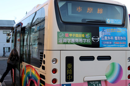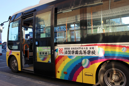 マグネットプレートは二種類で、縦二十五センチメートル、横百二十センチメートルの白地に黒を基調とした側面用が乗降口の横に掲示してある愛東・湖東・市辺上平木の三路線と、スクールカラーのグリーン地に校章と市章があしらわれた縦二十五センチメートル、横七十五センチメートルの車体後部用が掲示してある市原・沖野玉緒・大中の三路線の、六路線で運行している。東近江市から滋賀学園高校のセンバツ出場を、乗降客や後ろを走行するドライバー・同乗者の目に訴えている。