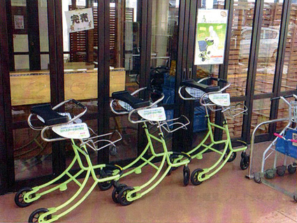 (株)明尚(本社守山市、廣田岳尚社長)が運営する「リハステーション守山デイサービス」(同市)は関西の介護保険施設としてはじめて、光プロジェクト(鳥取県西伯郡大山町)が開発した買い物をリハビリに変えるお年寄り用カート「楽々カート」を介護の現場に導入してきたが、このほど、施設利用者が買い物を通じてリハビリができるように、守山市のショッピングセンター「ファーマーズマーケット・おうみんち」(同市洲本町)とタイアップして同カート三台(写真)の常設を行った。導入には、県の要介護度改善推進モデル事業による補助金を活用している。