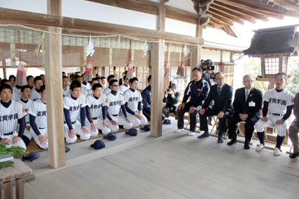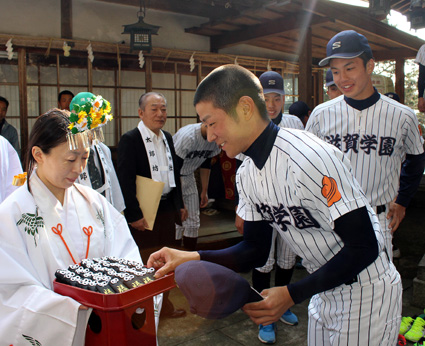 第88回選抜高校野球大会に出場する滋賀学園高校硬式野球部は先月28日、勝運の神として知られる東近江市小脇町の太郎坊宮阿賀神社に、甲子園での必勝を祈願した。