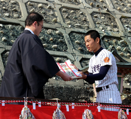 山上駐車場広場では壮行セレモニーも開かれ、必勝の祈りを込めた御園ふるさと太鼓「八風太鼓」の勇ましい演奏が響く中、敬神講社の畑重三さんを中心に役員や氏子総代らで製作された東近江大凧「祈 必勝 滋賀学園!!」と、川居忠子さん(88)が作りためた千羽鶴約3,000羽で飾られた壇の上下に部員たちが勢ぞろい。奥田素之宮司から特製「必勝祈祷神札」の授与を受けた今谷主将が「甲子園では初戦突破できるよう、粘り強くチーム一丸となって戦います。応援よろしくお願いします」と集まった人たちに感謝と決意を披露した。