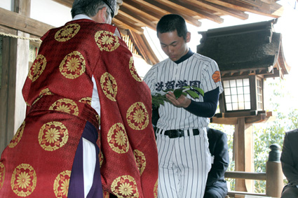 部員54人と学校関係者、保護者ら約130人は、本殿で一人ひとり必勝を祈願したあと、拝殿での必勝祈祷に臨んだ。神職による祝詞奏上、巫女による神楽につづき、今谷真一郎主将の玉串奉奠に合わせて、選手全員で拝礼を行った。部員一人ひとりに、黒地に金で「勝」の字が刺繍されたお守りが配られた。