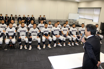 小椋正清市長がセンバツ出場を祝うとともに、「名誉なこと。大きな思い出になる。感謝の気持ちを持ち、常勝を目標にしてもらいたい。体調を十分に整え、平常心で、実力の一五〇パーセントを出す度胸をもって、自分自身のために、悔いの残らないよう、全力を尽くしてほしい。皆さんの活躍は東近江市民の喜びと誇りです」と激励し、まずは初戦突破を願った。