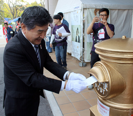もう一つの事業「10年後への手紙」では、小椋市長が「未来はがき」を金色の「未来ポスト」に最後の投函をして、10年後への希望を膨らませた。2,500通近くの「未来はがき」が市民から寄せられている。