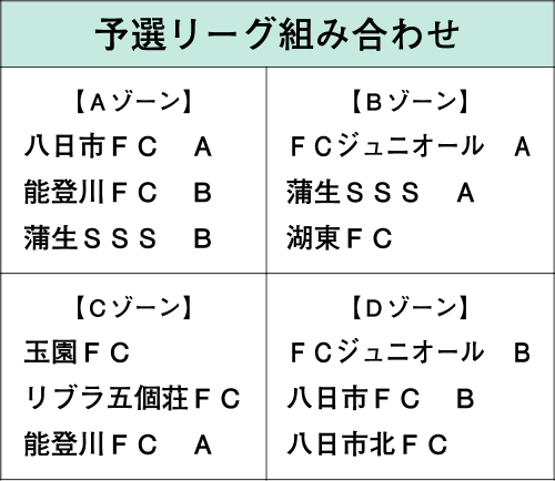 大会は、三チームずつ四ブロックに分かれて二十分一本で予選リーグを戦い、勝ち点(勝者三点、引き分け一点、敗者〇点)と得失点差等により順位を決め、各ブロック順位別四チームずつによる十五分ハーフの準決勝戦・最終順位決定戦に進む。