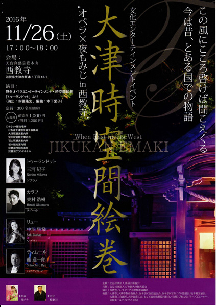 西教寺(大津市坂本)は二十六日午後五時から、「大津時空館絵巻オペラ×夜もみじin西教寺」を開催する。