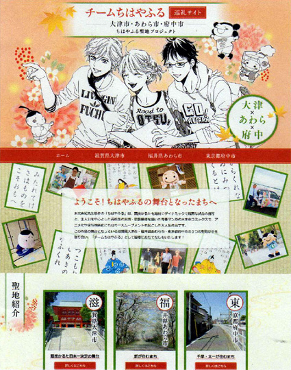 内容は、競技かるた日本一決定の舞台である大津市、登場人物たちが住む福井県あわら市、東京都府中市で作品中の舞台となったスポットなど。サイトURLはhttp://www.otsu.or.jp/chihayafuru/