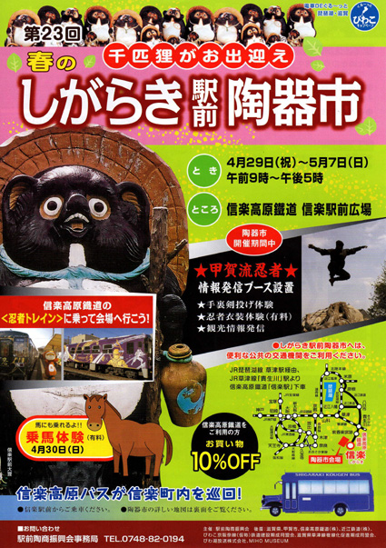 同鐵道の発着駅である信楽駅・駅前広場(甲賀市信楽町)では、春のしがらき駅前陶器市(駅前陶商振興会の主催、信楽高原鐡道など後援)が、29日~5月7日の午前9時から午後5時まで開催される。