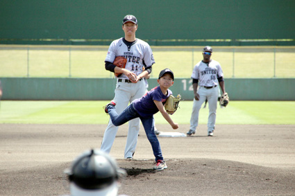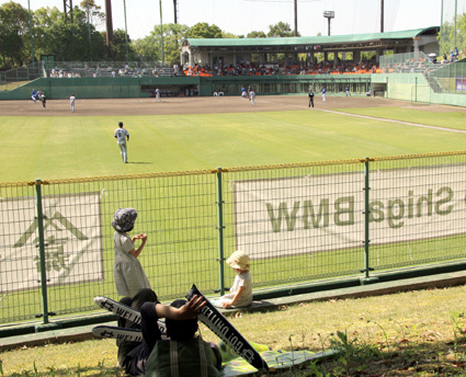 ゴールデンウィーク最終日の7日、東近江市の湖東スタジアムに412人の観客を集めてプロ野球独立リーグ「ルートインBCリーグ」のホームチームの滋賀ユナイテッドBC対石川ミリオンスターズ戦が開催され、滋賀が9回サヨナラで湖東スタジアム初勝利を飾り、スタジアムは大いに沸いた。スタンドには家族連れの姿が多く見られ、友達家族と観戦に来て始球式の幸運を射止めた小林篤武くん(山上小学校4年、永源寺リトルスターズ)は「緊張したけど、貴重な経験ができた」と喜んだ。
