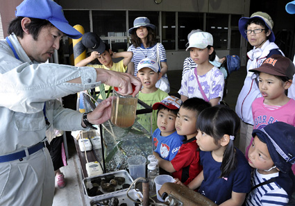 参加者らは、グリーン近江農協安土カントリーに集合したあと、琵琶湖博物館の魚の専門家から「どうしてびわ湖の魚は水田で育つのか」や「何を餌にして育ち、いつびわ湖に帰るのか」などの解説に耳を傾けたり、水槽の中の魚の種類やミジンコを観察した。