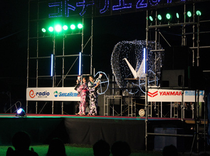 30万球のLEDイルミネーションで飾られたオブジェが夜のひばり公園(東近江市池庄町)に浮かび上がる「コトナリエサマーフェスタ2017」が5日開幕した。