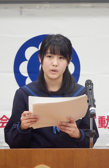 中学生の部の最優秀、真壁さんは「明るい社会にするためには」の中で、「コミュニケーション能力の低下」を犯罪・非行の原因とし、解決策として「一人一人がスマホの使い方を考え、家族や周りの人とのコミュニケーションを見直す」「親の愛のある家庭で教育できているのかをもっと積極的に調べたり、貧困を少しでも改善してあげたりする」と提案した。