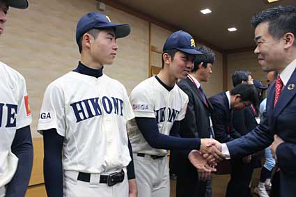 県庁では、大会に先立って激励会が行われ、3校がそろい踏みした。彦根東の高内希主将は「3校で力を合わせ、滋賀を熱くするプレーをしたい」、近江の中尾雄斗主将は「県勢初の優勝旗を必ず持ち帰る」、膳所の石川唯斗主将は「大きな舞台で強豪校に勝ち、全国の高校球児に夢と希望を与えたい」と、決意を力強く述べた。