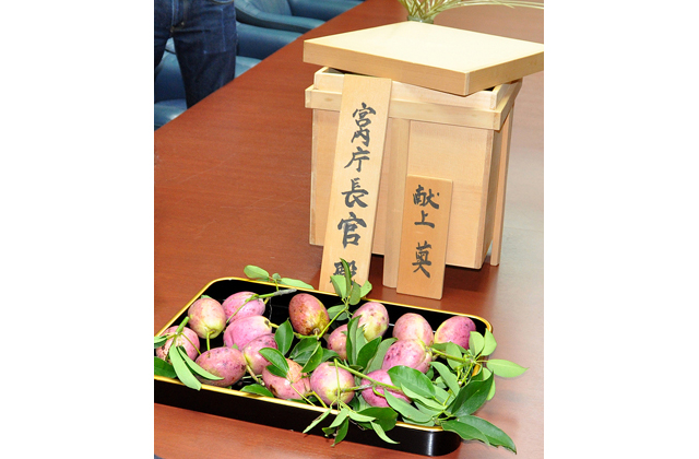 【近江八幡】近江八幡市北津田町の奥島山自然休養林に自生する「むべ」がこのほど、市役所で行器(ほかい=儀礼の際に食べ物を運搬する木製の器=)に納められ「天皇即位の礼」を前に皇室に献上された。