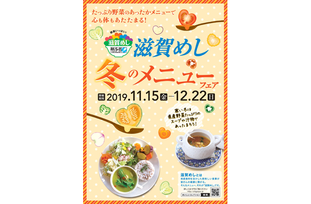 「滋賀めし」は、一食120グラム以上の野菜を使用し、かつ県産食材を二品目以上使用(うち一品目は野菜類か豆類を使用)したメニューです。これまでにも、産学官連携による取り組みを展開してきたところですが、今回は、県内約30事業者の皆さんのご協力により、12月22日まで「『滋賀めし』冬のメニューフェア」を開催しています。