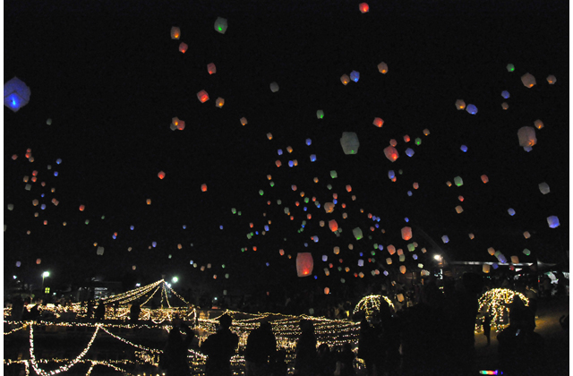 先月30日には点灯式が行われ、来場者のカウントダウンと共に一斉にイルミネーションが点灯し、歓声があがった。その後、スカイランタン500個の打ち上げも行われ、夜空に幻想的な灯りが広がった。