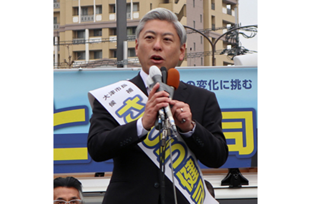 JR瀬田駅前で出陣式を行った佐藤氏には、支援する大津商工会議所の山本勝義副会頭、瀬田商工会の松尾房郎会長をはじめ陣営発表約300人が集まり、来賓として小椋正清東近江市長、有村国知愛荘町長、奥村芳正自民党県連幹事長がエールを送った。佐藤氏は「今の大津市政は、市民の声が届かず、夢が持てない」と述べ、「今こそ市民が主役で、しっかりとやるべきことはやる前向きな市政をつくっていかねばならない」と熱を込めた。