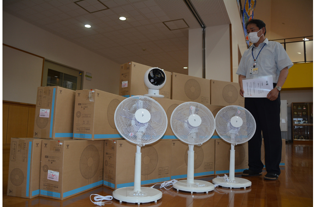 同校では、換気のため常に窓を開けておくなどの対応を取っているが、エアコンの冷気が外に漏れやすく、気温がさらに高くなるこれからの時期は児童らの熱中症などが危惧されていた。同校の伊藤晴朗校長は「空気を循環させるためにも今回の寄贈は非常にありがたい」と感謝する。