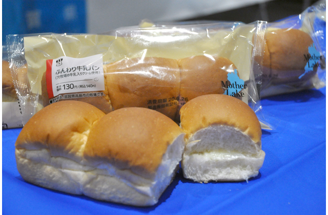 ▽ローソン=「ふんわり牛乳パン(宝牧場の牛乳クリーム使用)」(140円)。高島市朽木宮前坊の「宝牧場」でとれた牛乳を使用したミルククリームをふんわりとした生地で挟んだ、口どけが良く昔懐かしい素朴な味わいが特徴のパン。パッケージには「びわ湖の日」にちなみ、「Mother Lake(マザー・レイク)」のロゴマークを取り入れている。