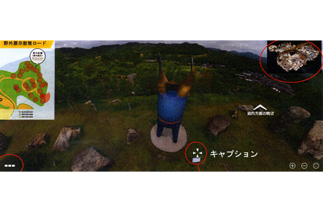 園内の「星の広場」の映像では、360度の眺望を楽しめ、広場で展示されている国内外の作家の作品について、画面上のキャプションを選択すれば、解説が示される。