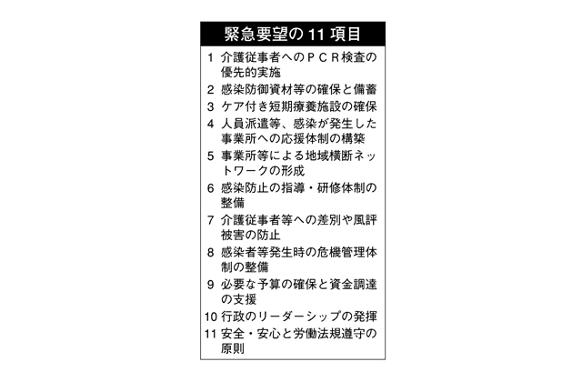 11項目にわたる緊急要請で「肝」となるのが、▽「人員派遣等、感染が発生した事業所への応援体制の構築」、▽「事業所による地域横断ネットワークの形成」、▽「行政のリーダーシップの発揮」―の3項目。