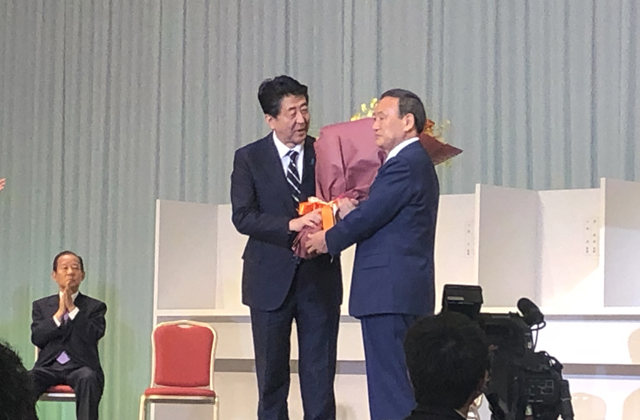 続いてあいさつに立たれた菅新総裁は、安倍総理に花束を贈呈され「万雷の拍手をお願いします」と会場に呼びかけられました=写真=。すると期せずして出席者全員が起立をして安倍総理に拍手を贈ったのでした。そしてその拍手は安倍総理が退出されるまで鳴りやむことはありませんでした。その後菅新総裁は規制改革や縦割り行政の廃止など取り組みたい政策などについてお話しされ、最後は「一致協力して国難に立ち向かい、新型コロナを克服しよう」と締めくくられました。