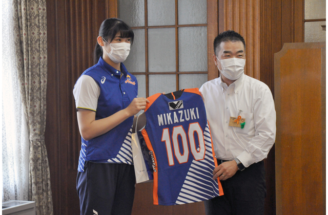 知事室でチームの現状を三日月知事に報告した越谷監督は「新型コロナの影響で集まれなかった時間を各選手の基礎トレーニングにあてることができた。開幕を控え、チーム全体がいい雰囲気で整ってきている」と述べ、山口部長は「コロナ禍でのリーグ開幕で、いろいろ制限はあるが、できるだけ多くの人に試合を見てもらって、元気になってもらうことに役立てれば」と意欲を語り、黒後選手が東レにちなんだ背番号100のユニフォームを三日月知事に贈った。